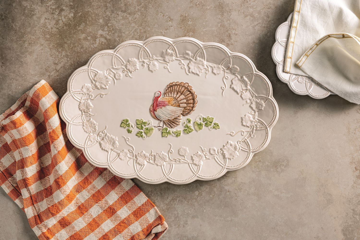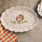 Serve your holiday feast in timeless style with our elegant Scalloped Stoneware Turkey Platter. Crafted from durable stoneware, this generously sized platter features a beautifully embossed turkey design at the center—perfect for Thanksgiving or any festive gathering. The softly scalloped edges add a touch of vintage charm, while the glazed finish provides a refined look and easy cleanup. Whether you're carving the main course or displaying seasonal treats, this platter brings warmth and tradition to your table.