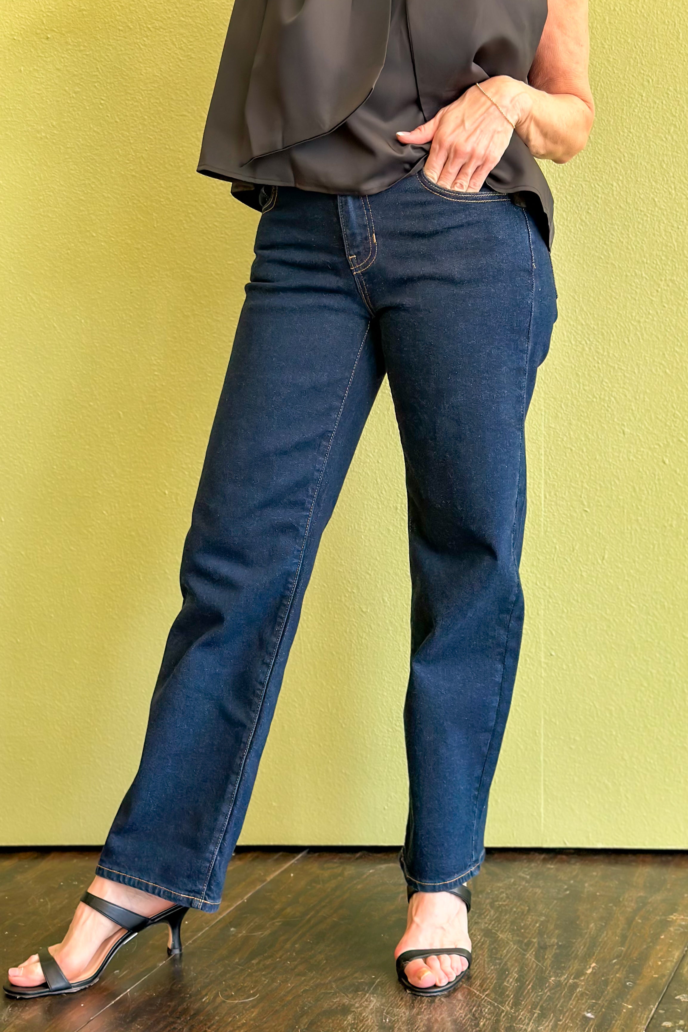 Bring back the effortless cool with our super dark straight leg jean — where vintage vibes meet modern comfort. Made from from soft stretch denim, they sit low on the waist with a relaxed, straight-leg fit that’s easy through the hip and thigh. The rich, dark wash makes them perfect for day-to-night wear — pair with a cropped sweater or a tucked-in blouse for that effortlessly laid-back look.