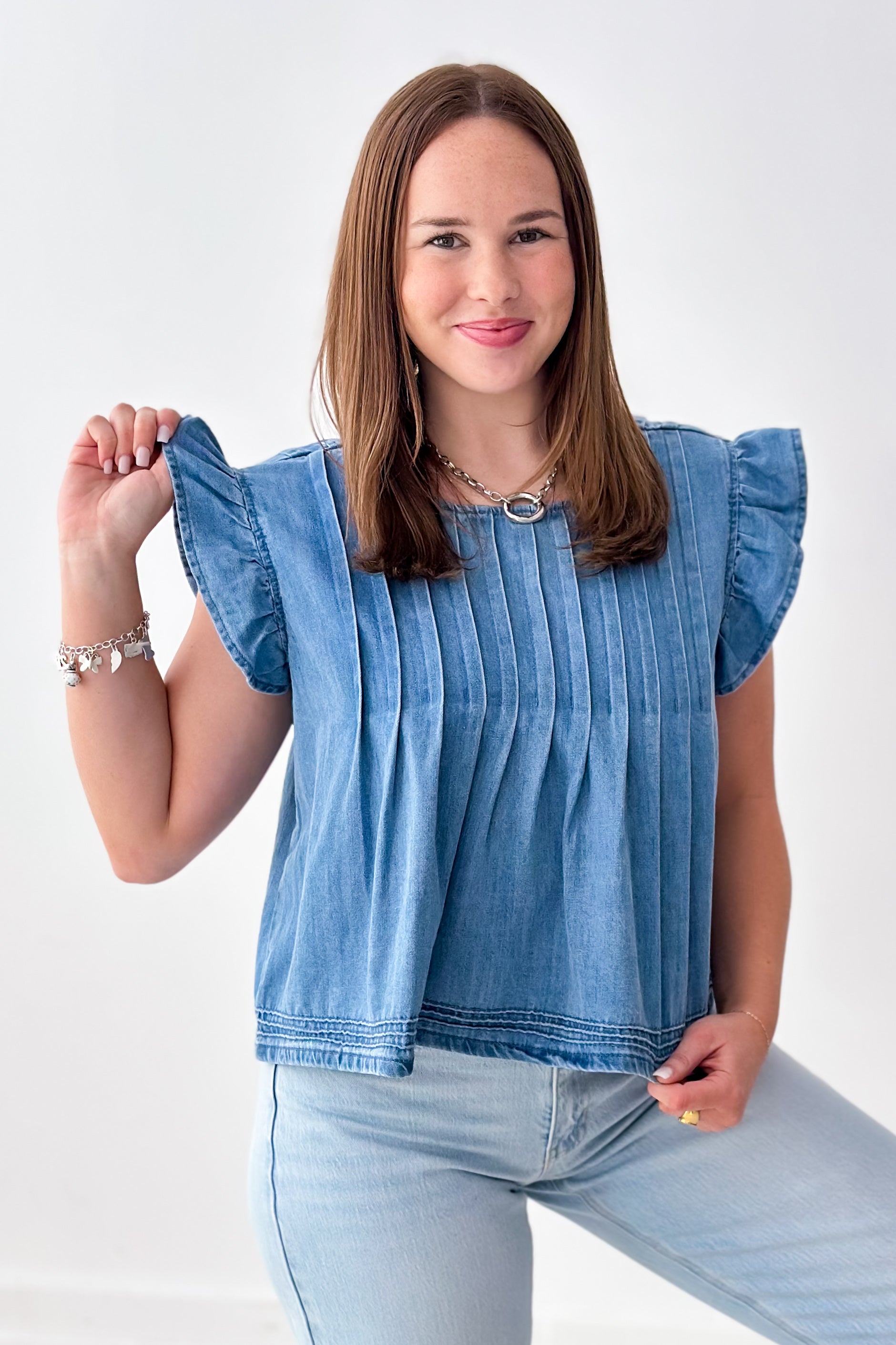 Fluttery sleeves meet vintage vibes in this pleated denim crop top. The cap sleeves add a touch of whimsy while structured pleats create flattering dimension through the bodice that lays so nicely. Perfect for pairing with high-waisted bottoms or layering over your favorite tee with a playful take on classic denim.