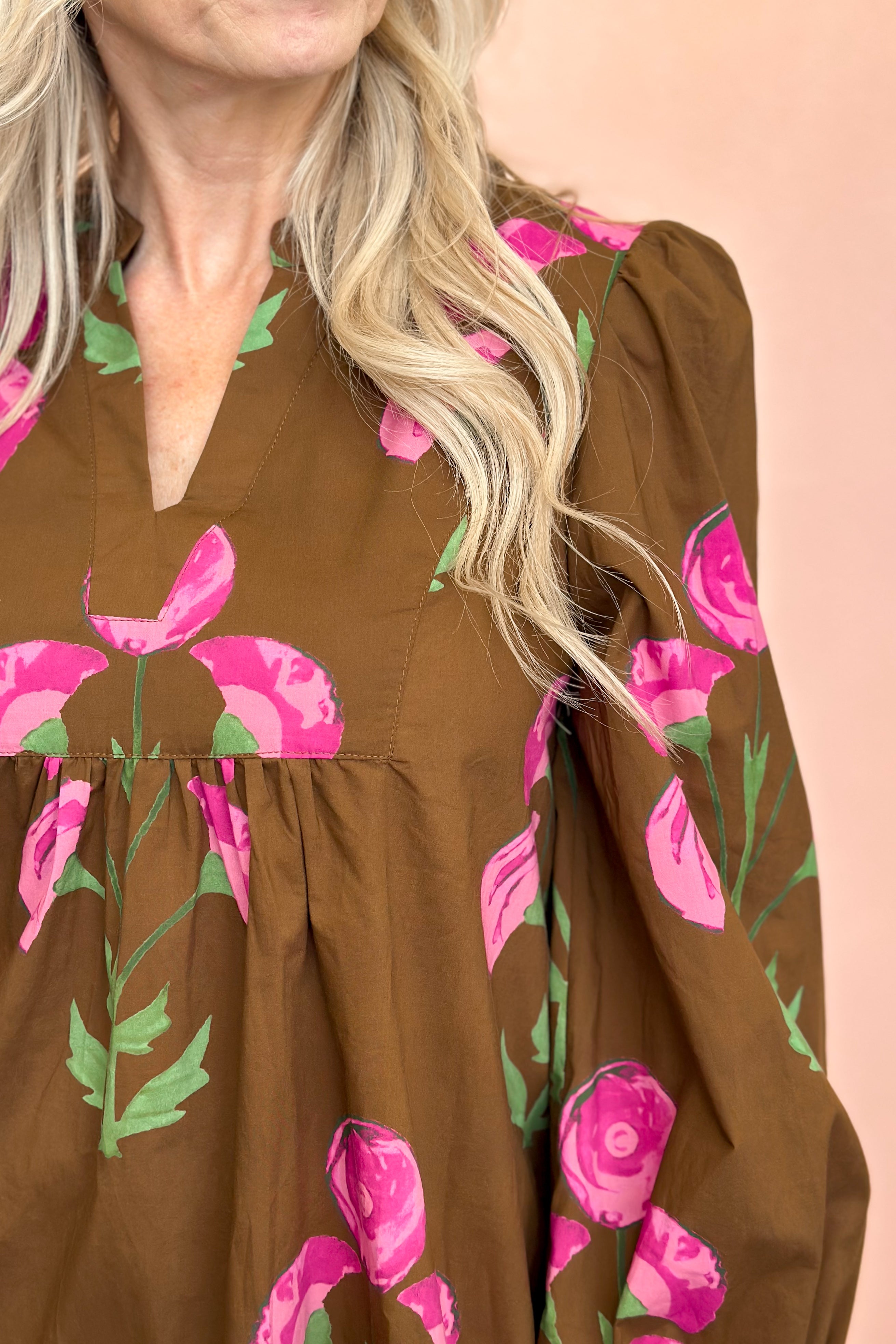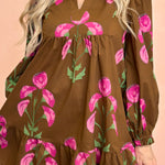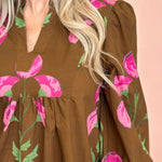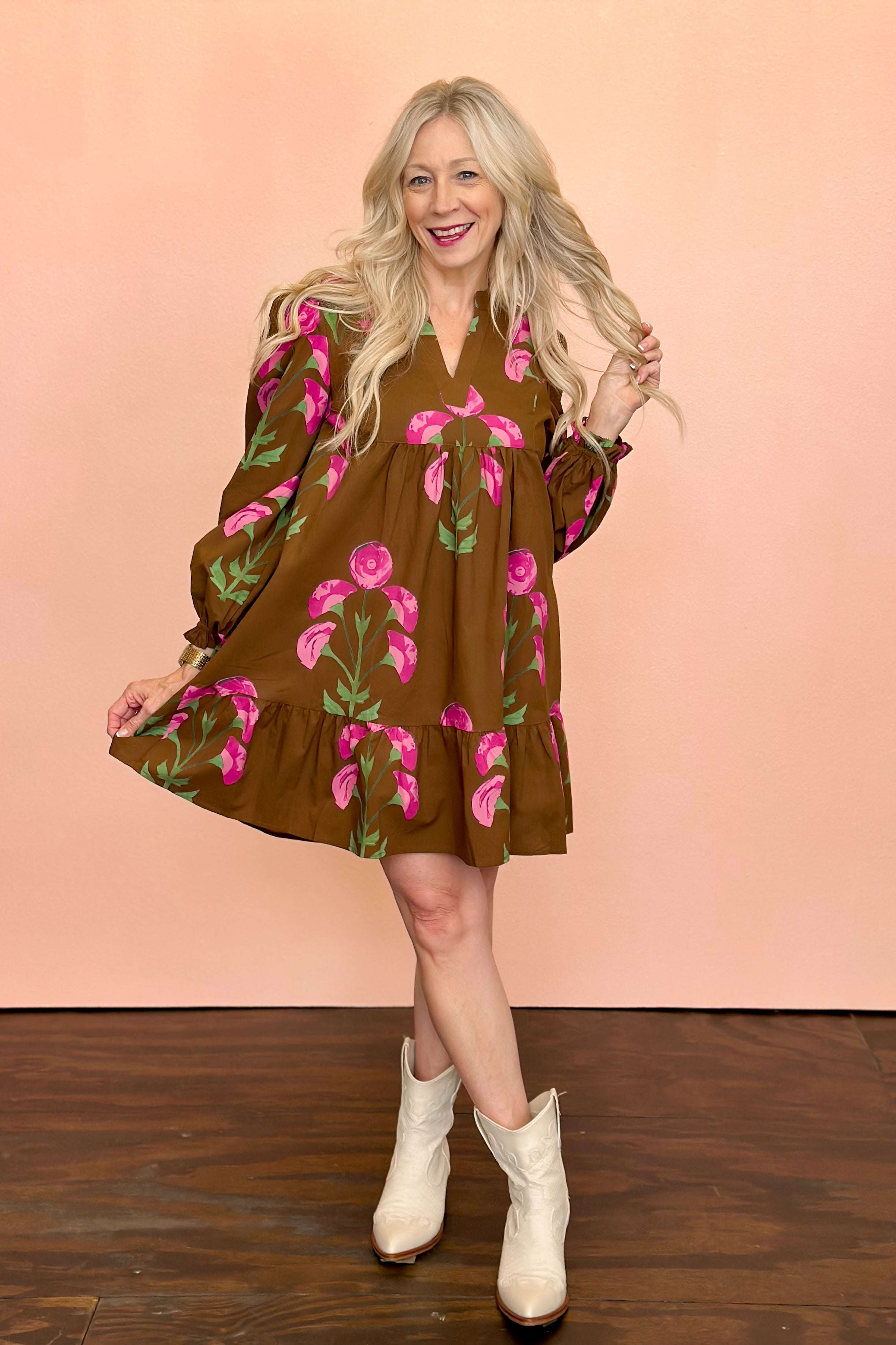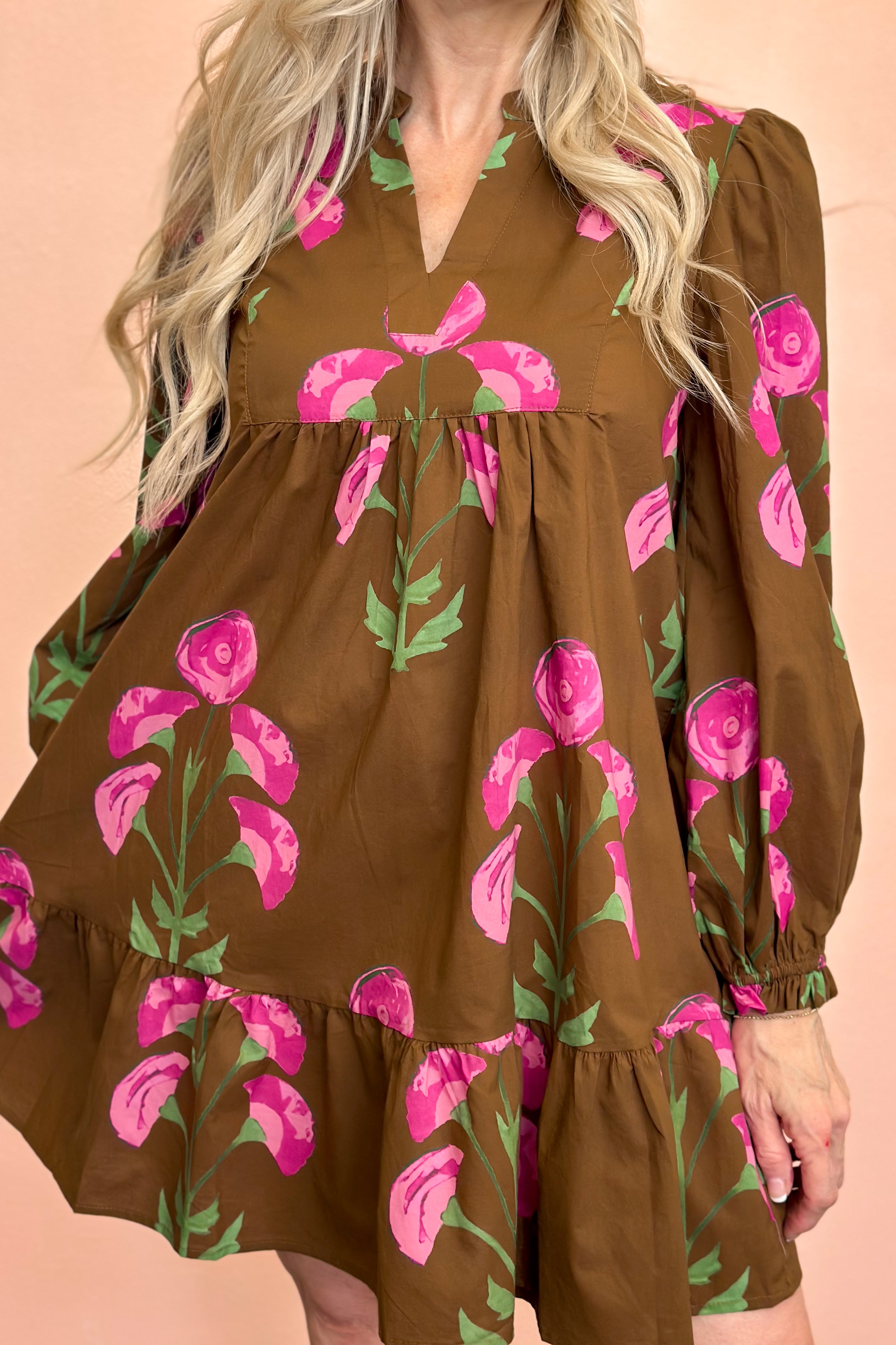 Sweet meets striking in the Cocoa Bloom Babydoll Dress. Crafted in a rich chocolate brown with bold fuchsia floral print, this flowy silhouette features a flattering empire waist, soft gathers, and a breezy fit that moves with you. Whether you're heading to brunch or a sunset soirée, this dress adds a pop of playful charm with a touch of vintage romance.