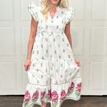 Soft, detailed, and effortlessly elegant, this cotton poplin maxi dress is full of heirloom-inspired charm. Layered flutter sleeves frame a flattering V-neck accented with blanket stitching, while delicate French knot details adorn the front bodice for a handcrafted touch. Finished with a ruffle collar and flowing tiered skirt, this dress moves beautifully with every step. Perfect for special days, celebrations, or anytime you want a romantic statement that still feels easy and wearable.