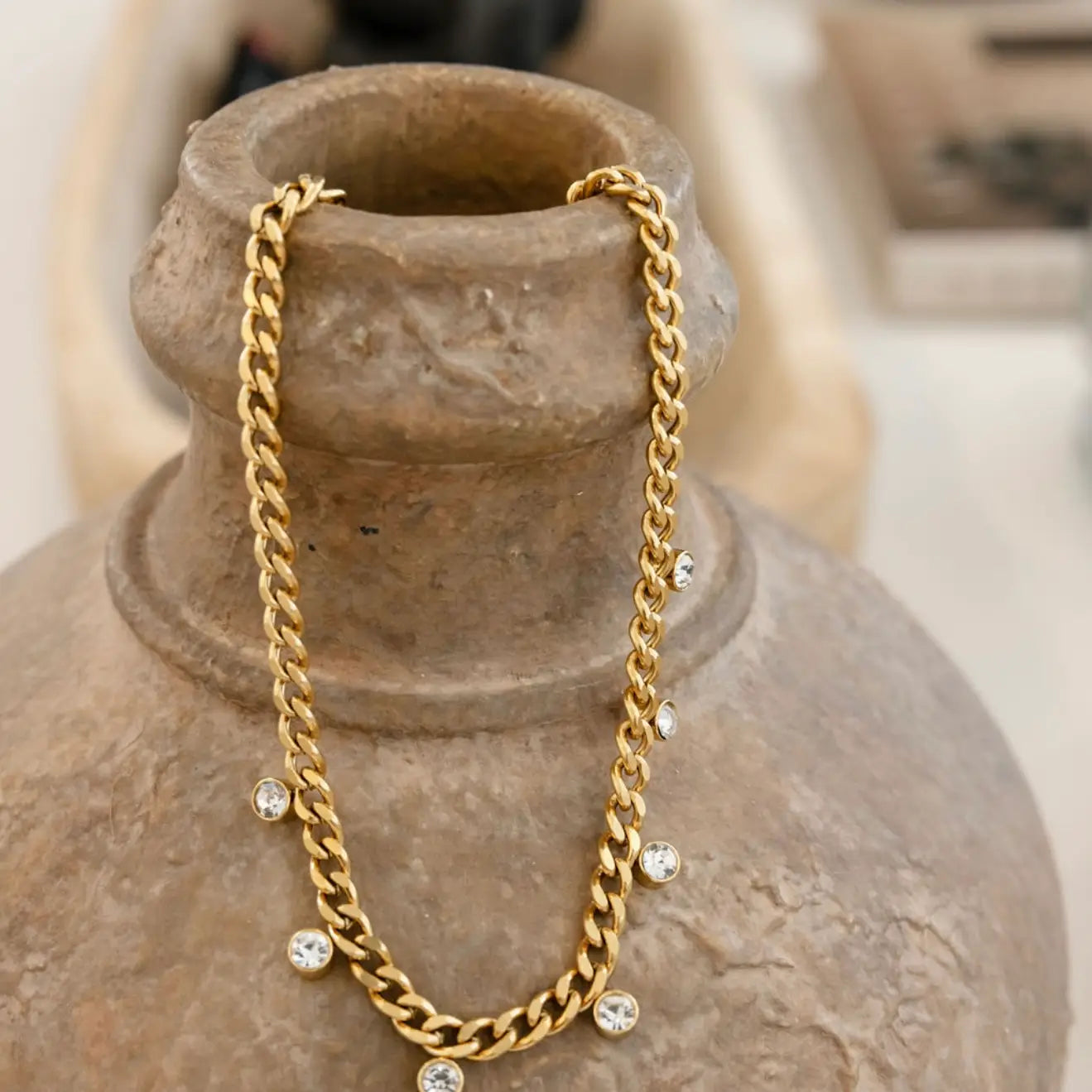 If you are love a necklace you can wear everyday but gives a high end look, the Zoe Necklace is it. With the hanging rhinestones on this chunky chain, it lays so nicely on your neck and is one and done!
