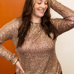Gold is a classic look for all your glam nights and that's why we had to bring this long sleeve sequin top. With back keyhole closure, this relaxed fit top works with all your gorgeous black bottoms but can also dress up your favorite denim.