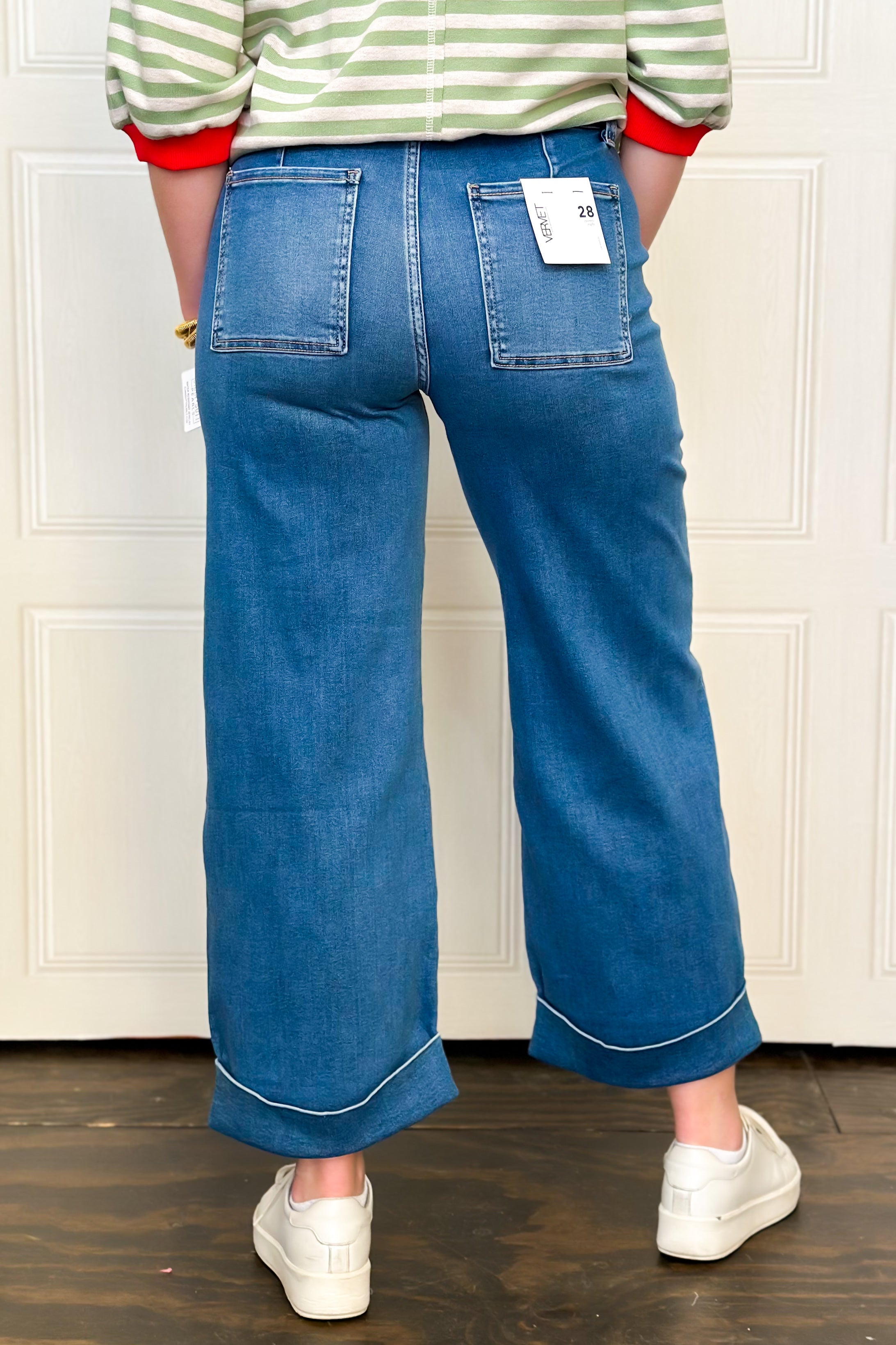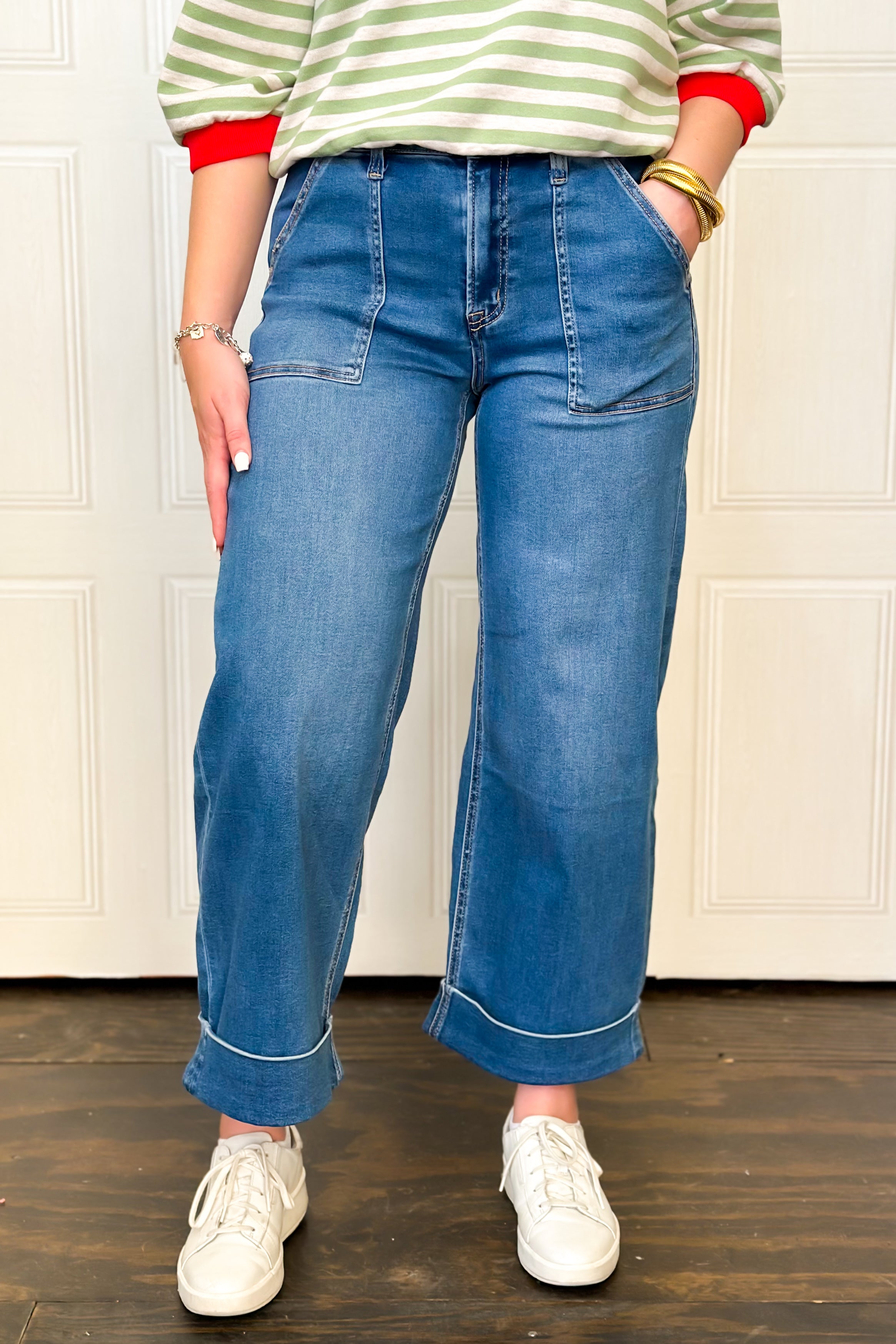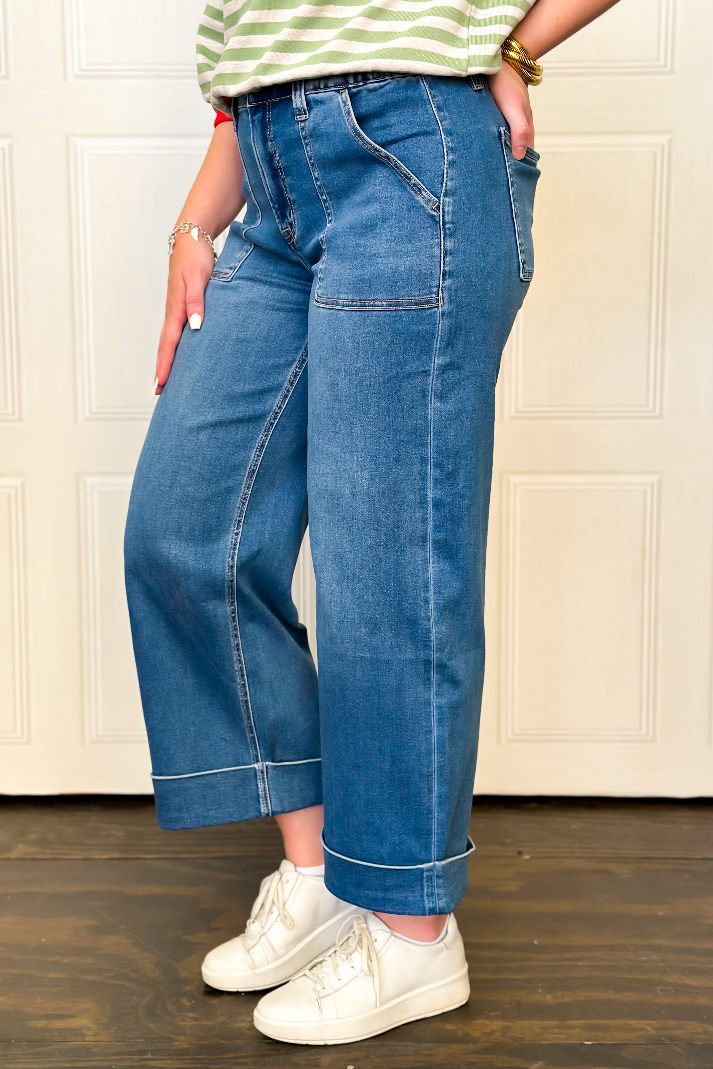 Your jeans should give you this much comfort and class all the time! Effortlessly cool with all-day comfort, these high rise baggy wide jeans are made from comfort-stretch denim and designed for an easy, relaxed fit. With a 3/4 elastic back, the double cuffed hem on the cropped length, blend structure with style. We know how much you love the long front pockets for a modern touch—perfect for casual days that still call for a great look.