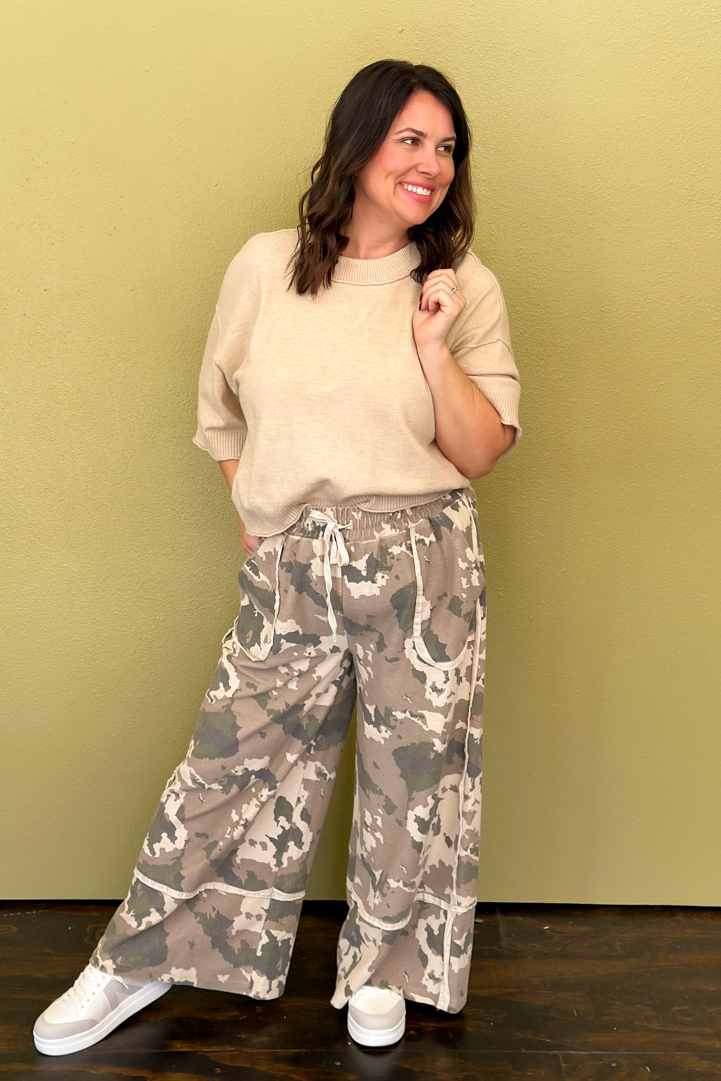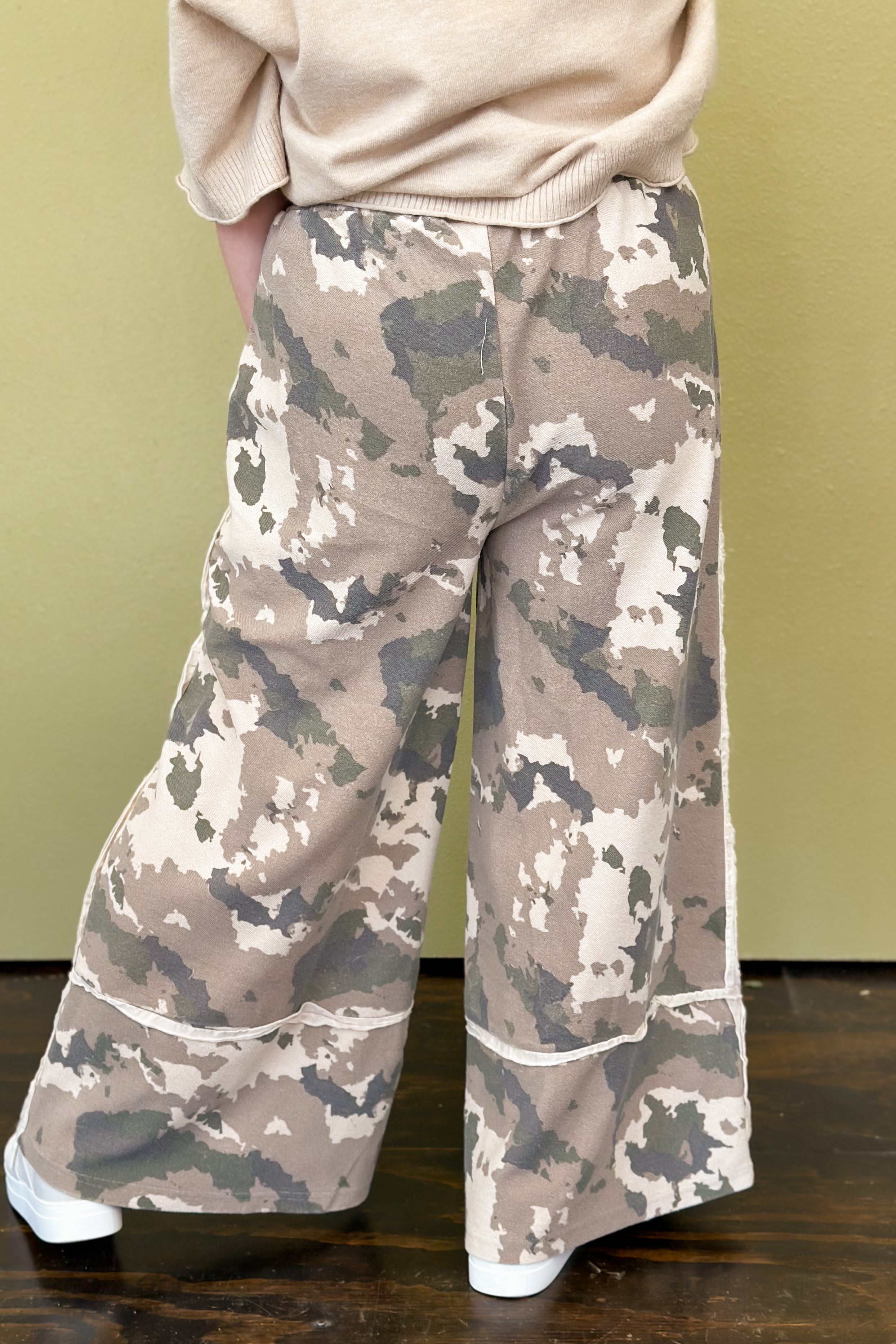 Effortlessly cool and endlessly comfortable, our Urban Terrain Washed Terry Pants feature a mineral-washed camouflage print for a lived-in, laid-back vibe. Designed with a wide-leg, relaxed fit, they’re finished with raw edge detailing, large front patch pockets, and a drawstring elastic waistband for all-day wear. The cropped length makes them perfect for pairing with sneakers or ankle boots for that off-duty, street-chic look.