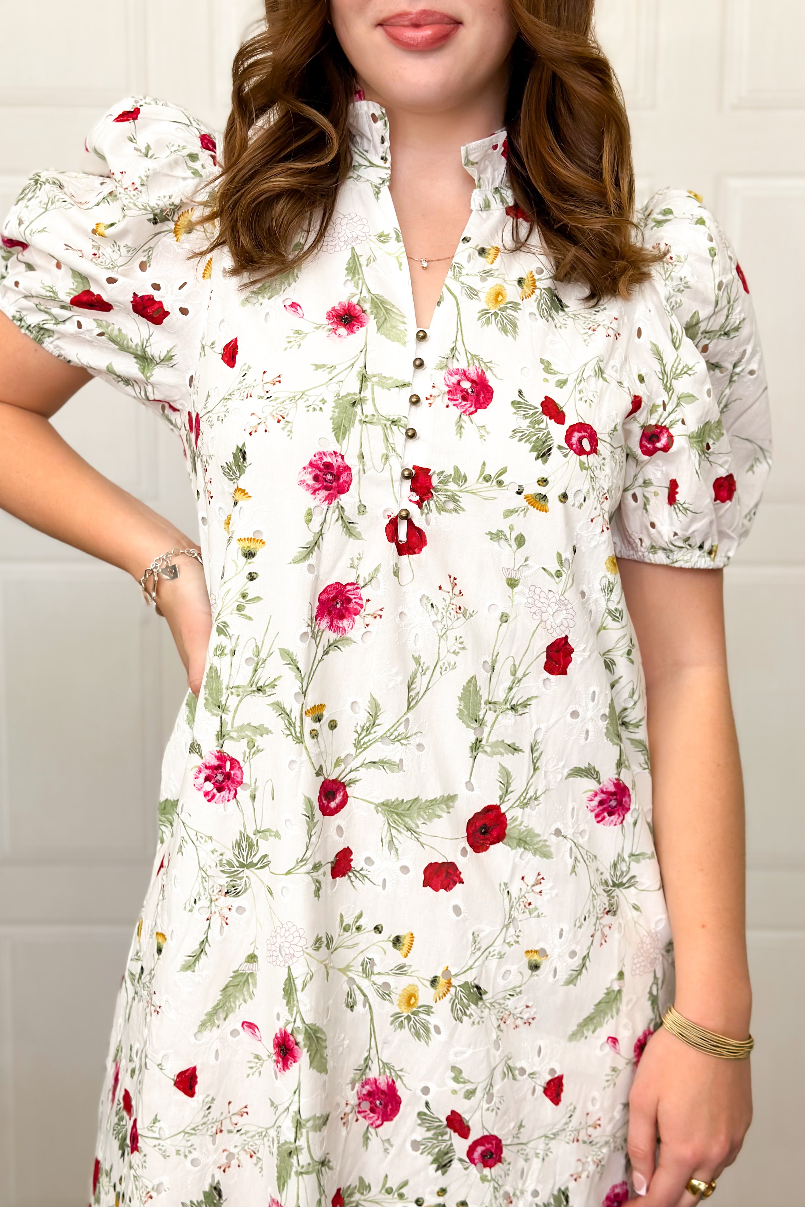 Soft, feminine, and beautifully detailed, this maxi dress botanical print is precious. Designed with a flattering V-neck opening and round button accents, this maxi features sweet puff sleeves, a ruffled neckline, and a flowy ruffled hem that moves gracefully with every step. The floral pattern layered over crisp white eyelet gives it a fresh, timeless feel — perfect for spring celebrations, weekend strolls, and days you want to feel effortlessly lovely.