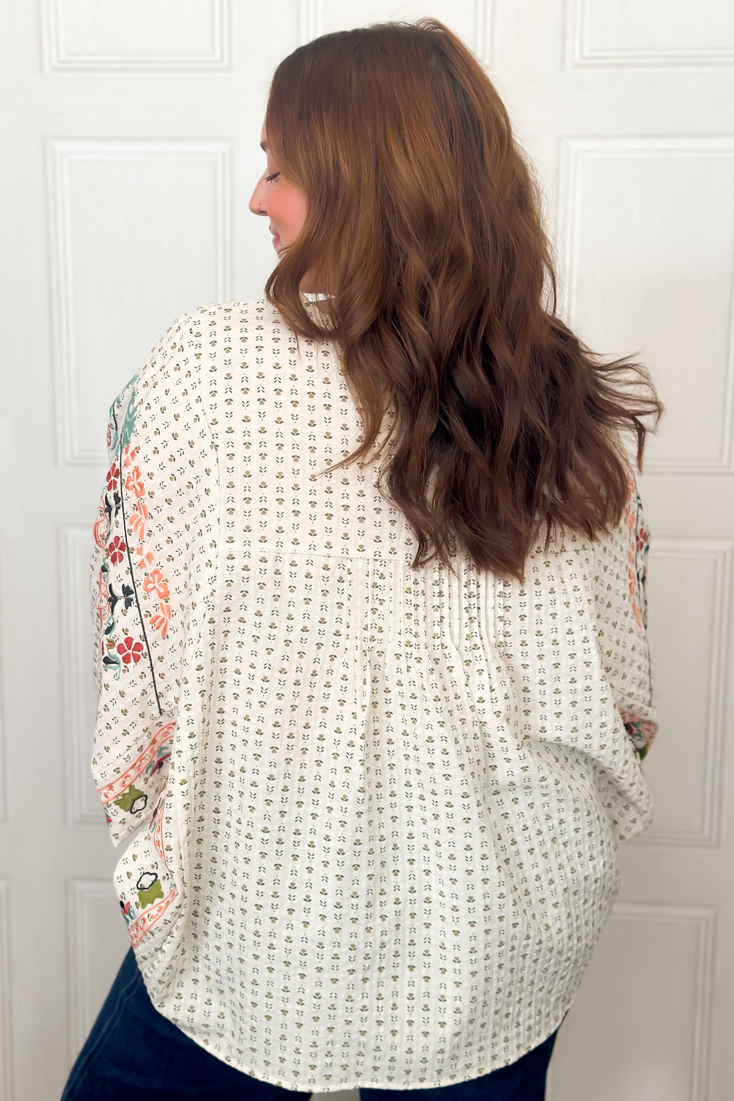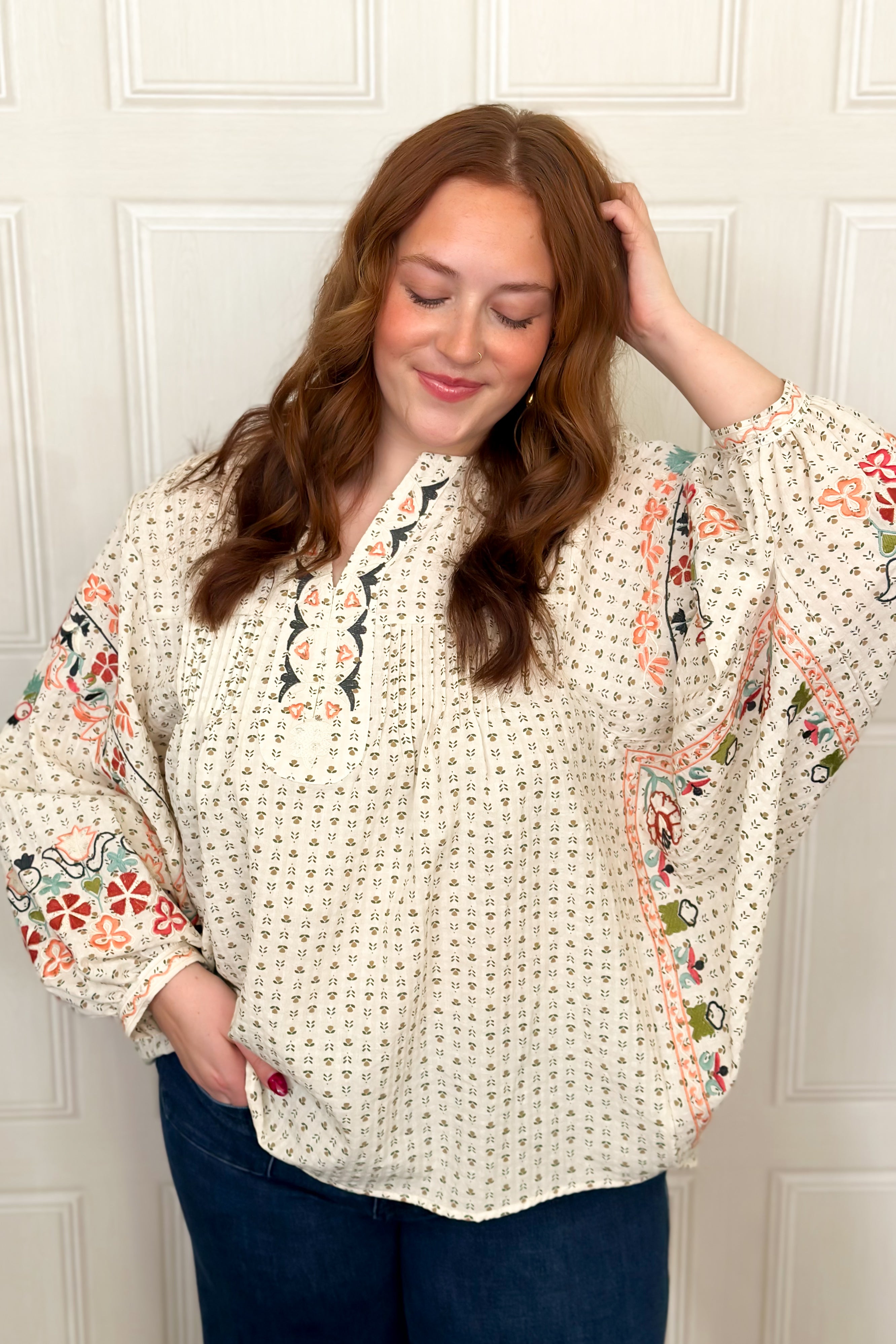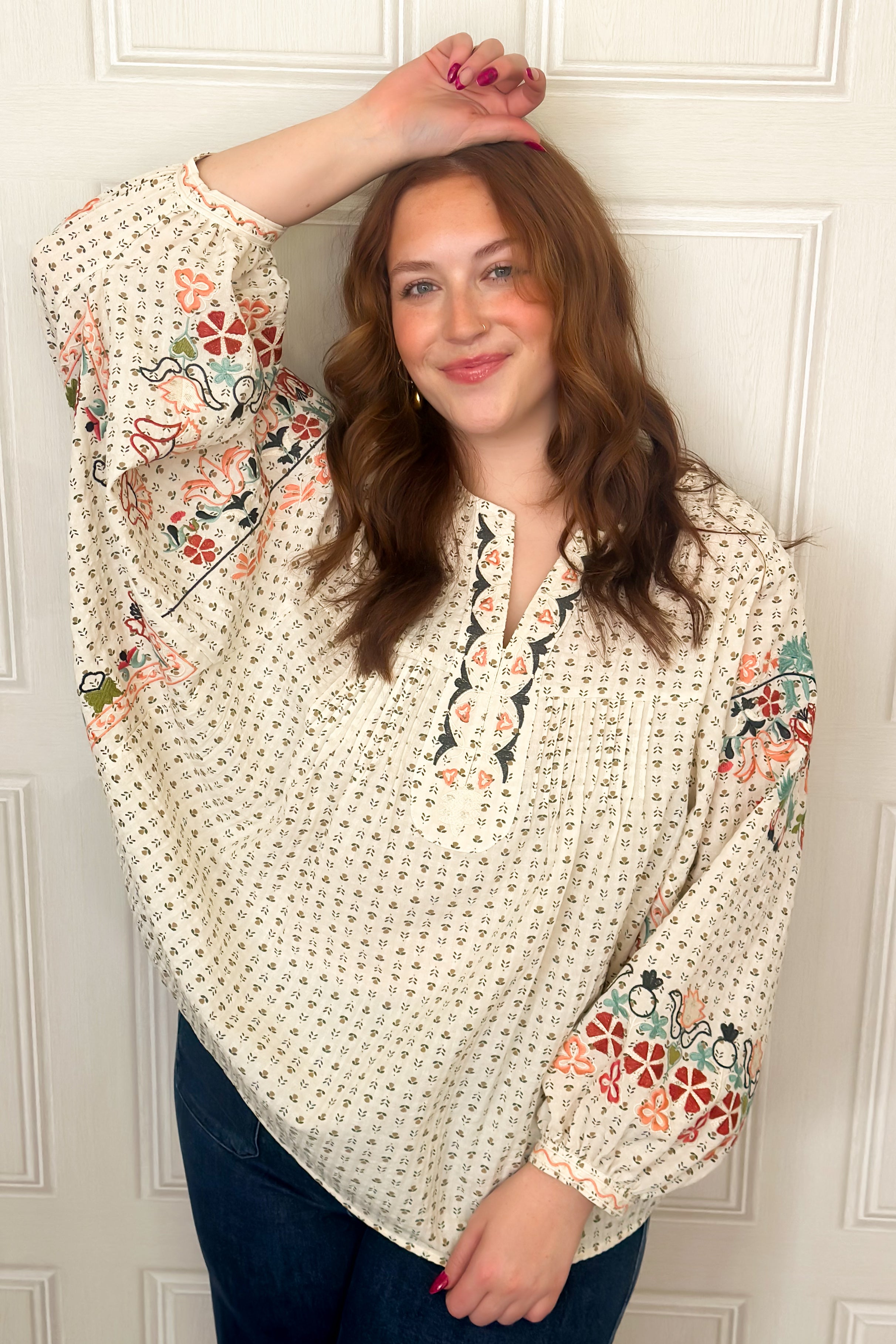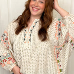 This embroidery detailing blouse blends effortless comfort with boho charm. Designed in a relaxed fit, it features a classic dot pattern with delicate embroidered florals for a soft, feminine touch. The notched neckline adds structure, while 3/4 balloon sleeves give an easy, elevated shape to this lightweight blouse. This blouse is so great for all seasons and a perfect transition piece too.